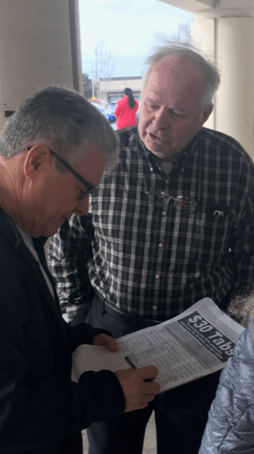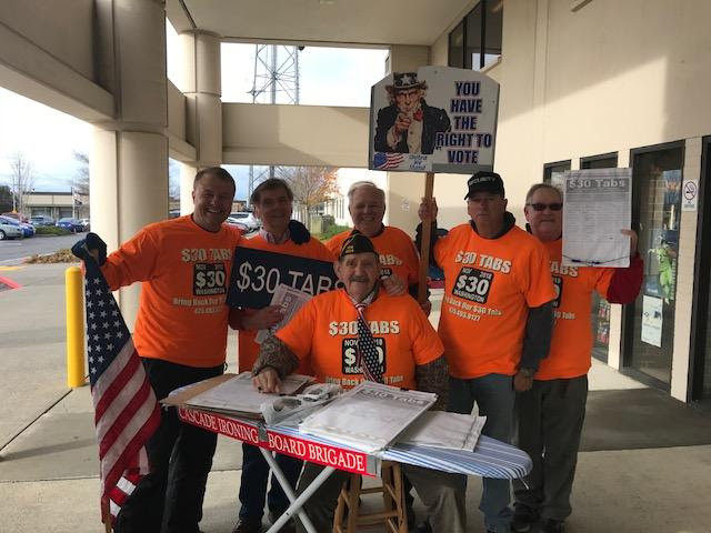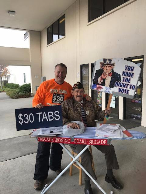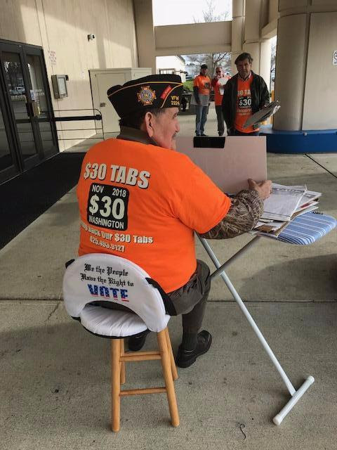 You gotta love these guys!! I spent yesterday morning in arctic rain and wind with guys who have been heroically getting signatures for the $30 Tabs Initiative at the Pierce County Annex in Tacoma (it’s where folks go to renew their vehicle tabs).