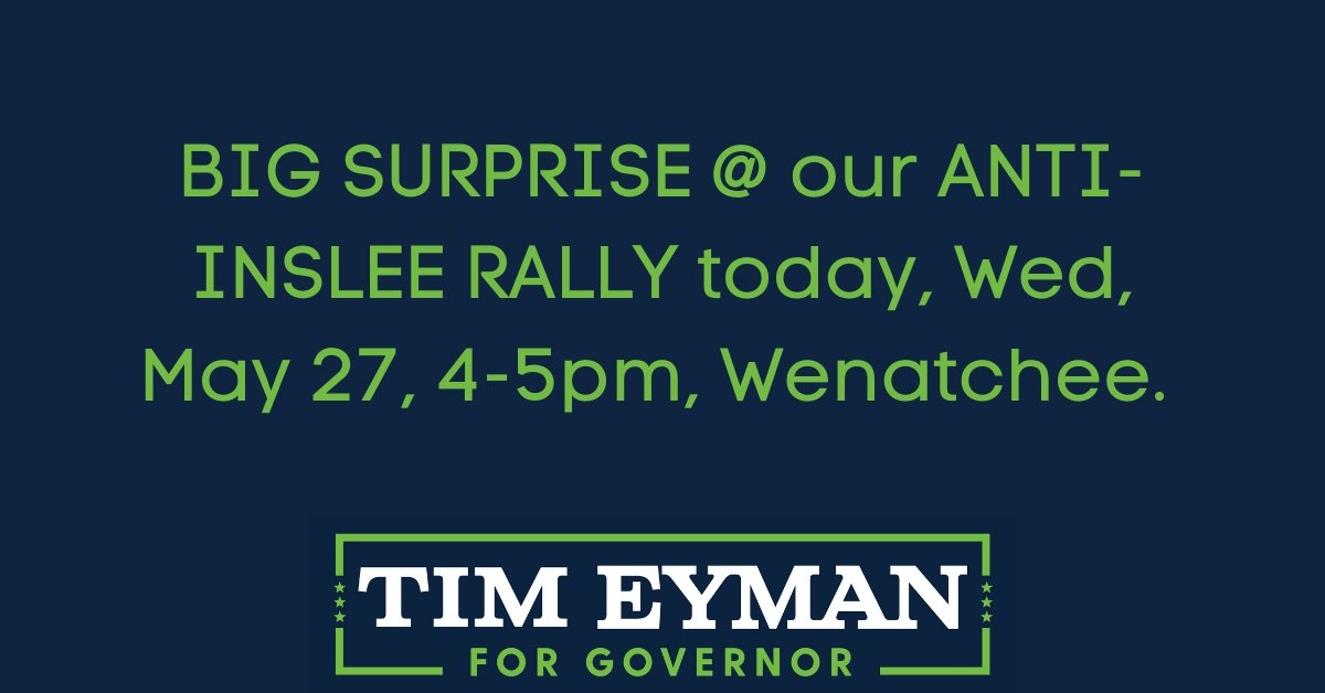 BIG SURPRISE @ our ANTI-INSLEE RALLY today, Wed, May 27, 4-5pm, Wenatchee. Join Eyman and his team @ rebellious restaurant for steak dinner. Eyman and his team are going there to support small businesses standing up for themselves, their employees, and their customers. Eyman is also trekking to Wenatchee for another reason — BIG SURPRISE. Watch it on Facebook live (4:30-5pm): Facebook.com/Tim4Gov