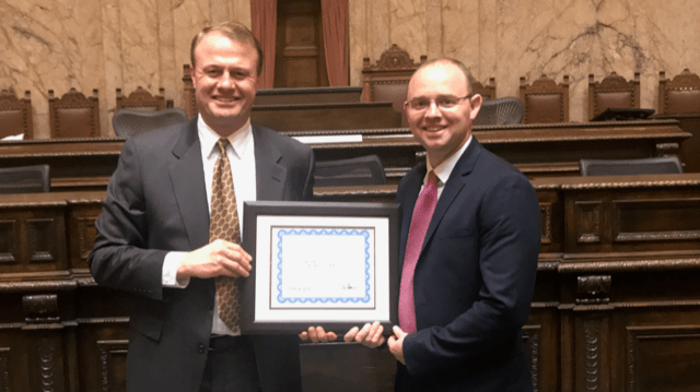 Congratulations again to Morgan Irwin for being named Legislator of the Year. His heroic efforts this last session to protect the initiative process are sincerely appreciated. On Friday, we met up in Olympia so I could give him his award: