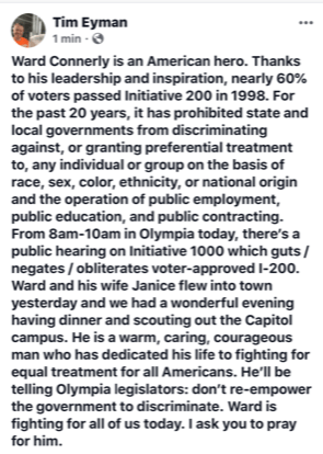 I was one of the original co-sponsors of Initiative 200, the Washington State Civil Rights Initiative. It was my first. I worked on it for nearly 9 months and loved every minute of it. But I was an abysmal failure at leading its’ signature drive, having never done one before. We weren’t going to make it. So I called John Carlson and literally begged him to take over. He did. I then called Ward Connerly and asked him to help save it. He did. I essentially put Initiative 200 up for adoption. The two of them qualified I-200 for a public vote and carried it over the finish line with nearly 60% of voters passing it.